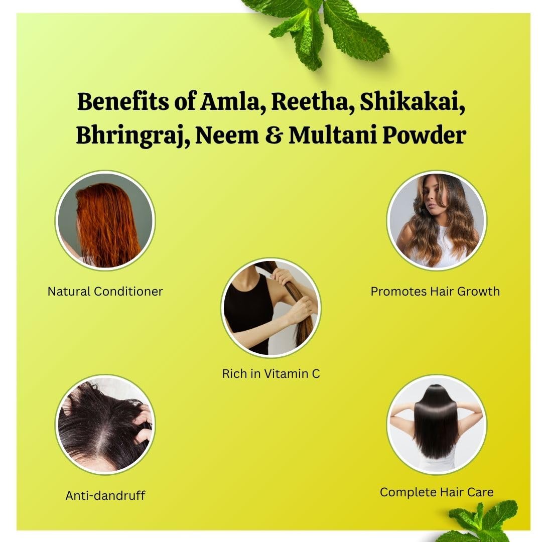 Amla Fruit Powder, Reetha Fruit Powder, Shikakai, Bhringraj Leaf, Neem Leaf & Multani Mitti Powder