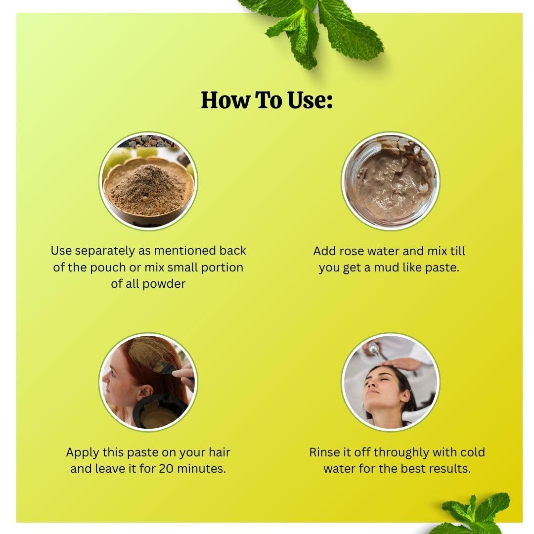 Way 1: Hair Mask- Mix a small portion of all powders in a bowl, add water/ curd/ egg/ to make a thick paste, apply liberally from roots to ends, leave for 30 min to 1 hour, wash off. | Way 2: Hair Shampoo- Mix a small portion of all the powders in a bowl, add water to make a thin mixture, apply as shampoo, massage the mixture for 10 min, wash off. | Way 3: Hair Color- Mix 20% of all powders with 80%henna powder and add water to make a thick paste, apply and let it dry, wash off.