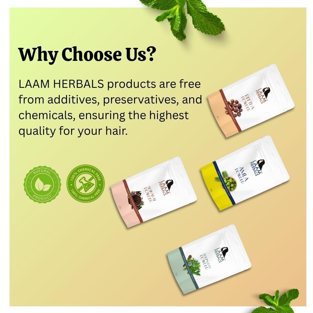 Laam Herbal AMLA, REETHA, SHIKAKAI & BHRINGRAJ powder is made from shade-dried fresh Fruit & Pods. The triple-sifted process makes it a lump-free powder that is easy to apply over face, skin and hair. There is no chemical added to this powder that may cause harm to your hair or skin. Completely Pure Powders that has no added chemicals & Preservatives, Synthetic additives or any other kind of impurities to be precise. These hair pack powders are made from drying and grounding grown handpicked organically grown Amla, Reetha, shikakai specially for use on hair and skin. Mixing small quantity of all can solve several hair & scalp related problems