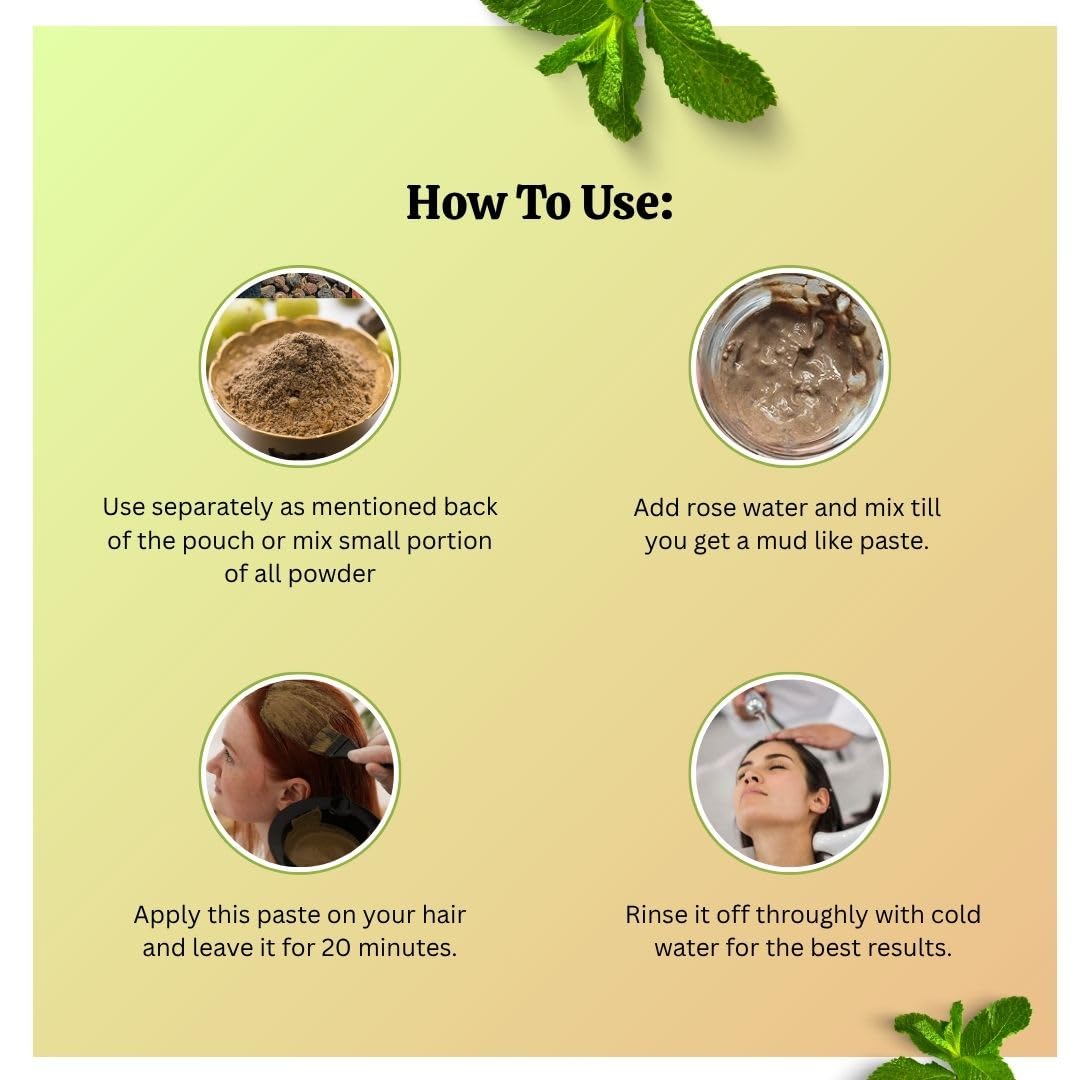 Way 1: Hair Mask- Mix a small portion of all powders in a bowl, add water/ curd/ egg/ to make a thick paste, apply liberally from roots to ends, leave for 30 min to 1 hour, wash off. | Way 2: Hair Shampoo- Mix a small portion of all the powders in a bowl, add water to make a thin mixture, apply as shampoo, massage the mixture for 10 min, wash off. | Way 3: Hair Color- Mix 20% of all powders with 80%henna powder and add water to make a thick paste, apply and let it dry, wash off
