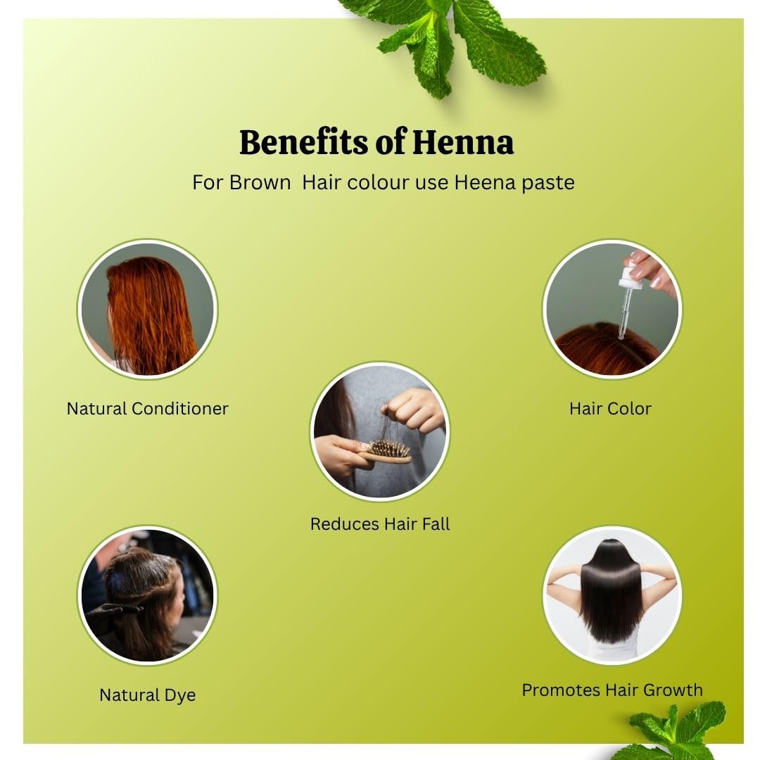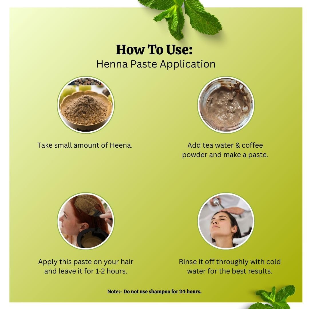 - Chemical-Free Coloring: Achieve a rich, dark-brown color without harsh chemicals. Our henna paste, rich in natural ingredients, is safe for all hair types, free from harmful additives, parabens, and chemicals.