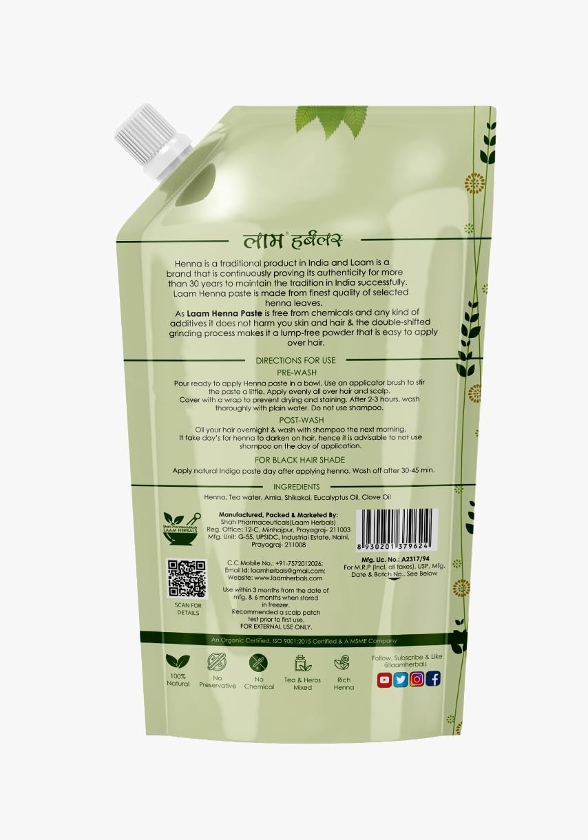 Laam Herbals- Fresh Ready To Apply Henna Paste, Pre-Soaked in Tea & Herbs, 100% Natural Rajasthani Henna 220 g