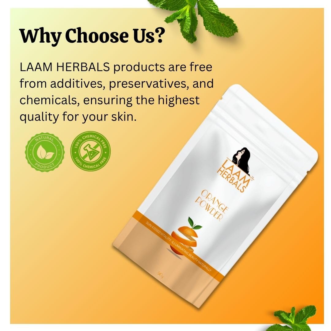 Ingredients: 100% Pure Orange Peel Powder | Suitable For: Hair and Skin Care | The orange peels are rich in fiber, vitamin C, folate, vitamin B6, calcium and other essential nutrients. The skin of the oranges contains a good amount of polyphenols & limonene that protect against several diseases. | Laam Orange powder is made from sun-dried fresh Orange peels. The triple-sifted process makes it a lump-free powder that is easy to apply over face, skin and hair. There is no chemical added to this powder that may cause harm to your hair or skin.