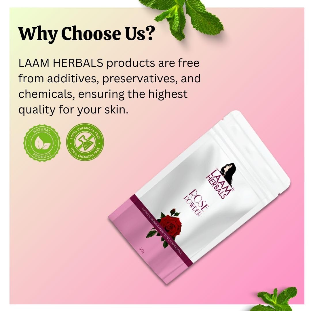 Laam Rose powder is made from shade-dried fresh Rose flowers. The triple-sifted process makes it a lump-free powder that is easy to apply over face, skin and hair. There is no chemical added to this powder that may cause harm to your hair or skin.